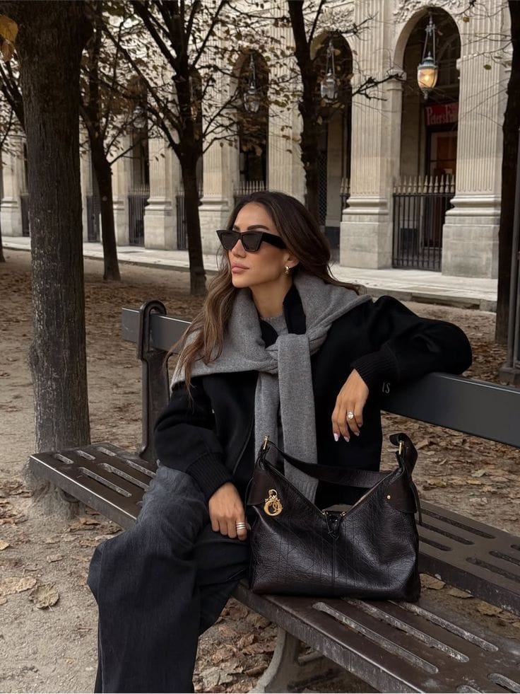 She’s keeping it effortless in a black jacket with a soft grey sweater casually draped over her shoulders, paired with relaxed charcoal trousers for that low-key chic park-day vibe. Oversized sunglasses, layered rings, and a slouchy black shoulder bag pull everything together like the perfect “I just threw this on” outfit.