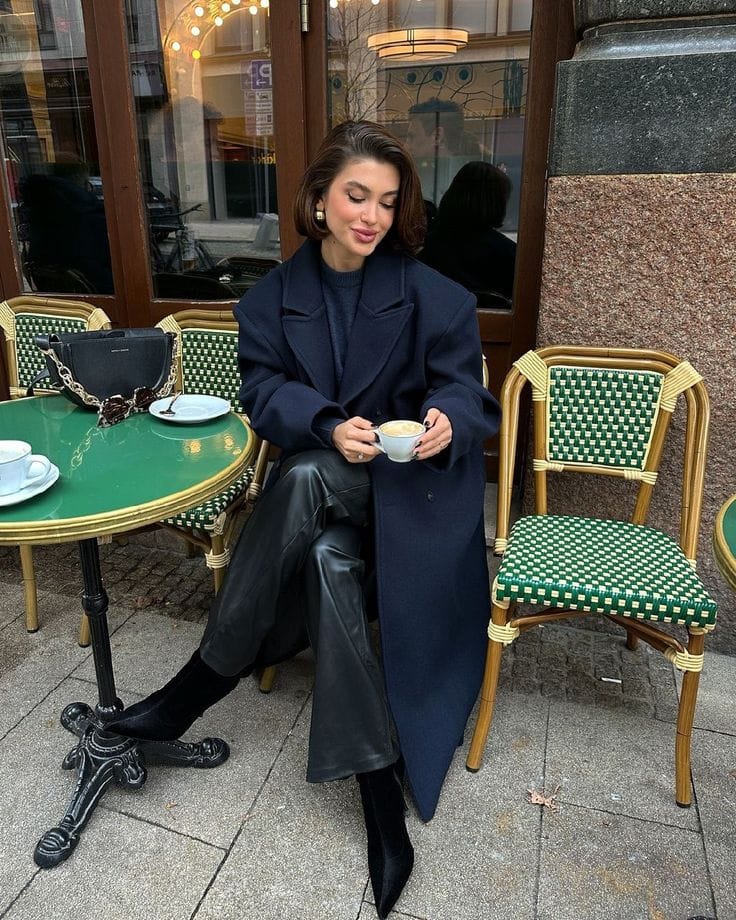 She’s serving Parisian café chic in a long navy coat layered over a dark knit top, styled with sleek black leather wide-leg trousers for that polished, moody vibe. Pointed black boots, a structured black bag with a chain detail, and bold gold hoop earrings finish the look while she sips her coffee outside.
