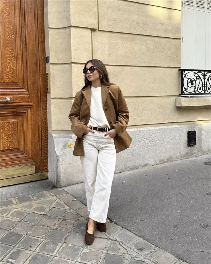 18. Caramel Suede Blazer with Soft Ivory Tee & Tailored White Trousers