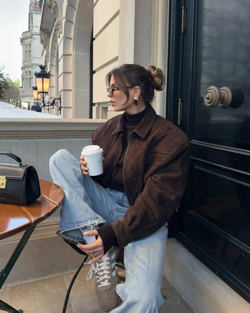 @ heloise.guilletThis cozy ensemble stars a brown suede bomber layered atop a black turtleneck, relaxed blue jeans, and sporty taupe sneakers. A classic black purse and gold statement earrings bring laid-back chic to cafƩ mornings.