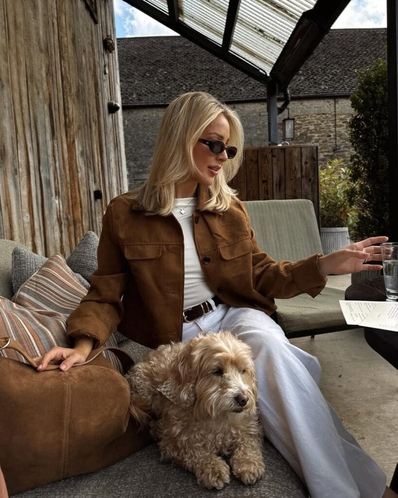@ allchloeroseSheās styled a soft caramel suede jacket over a classic white tee paired with relaxed ivory trousers. The look is breezy and chic, finished with a suede tote and a cute fluffy companion.