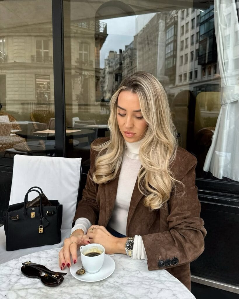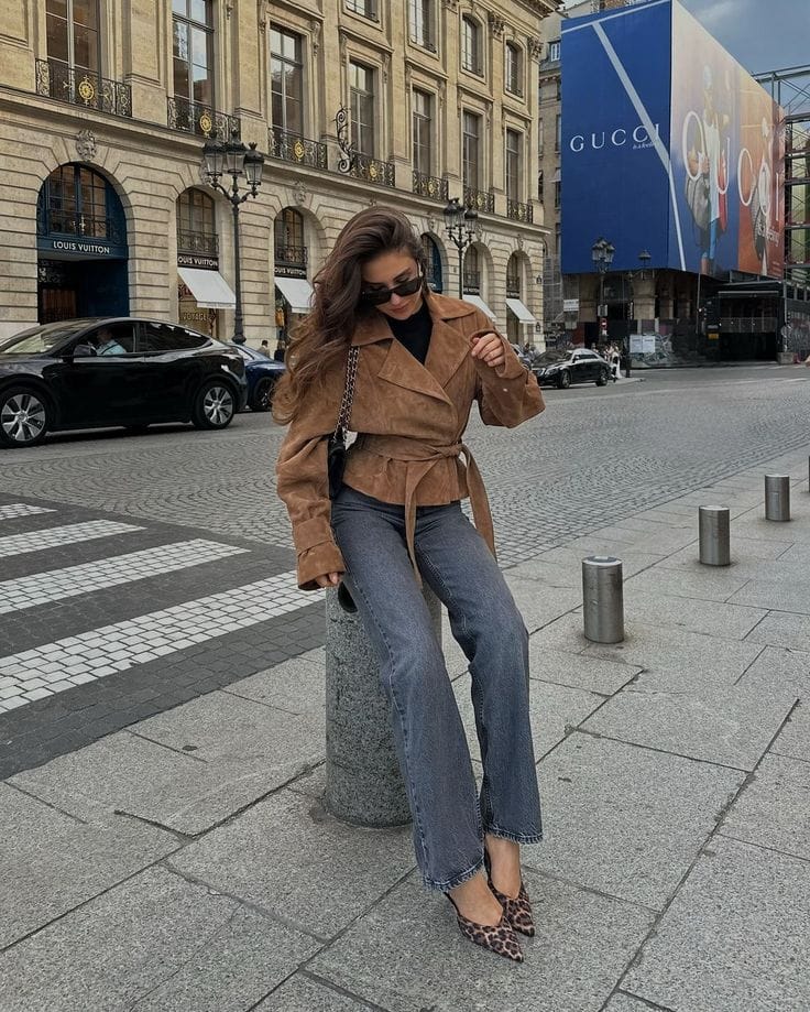 @ freyakillinSheās channeling Parisian elegance in a plush brown suede blazer, creamy turtleneck, and tailored navy trousers. Gold jewelry and a structured black bag give the outfit timeless cafĆ© charisma.