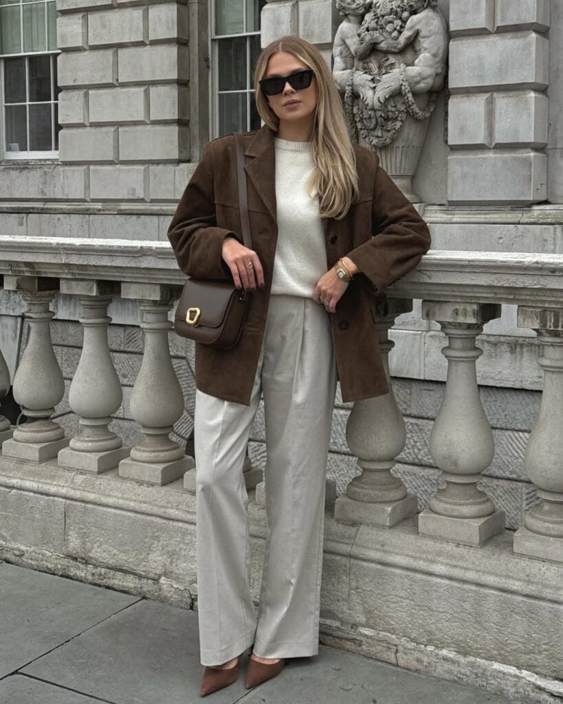 @ mildagudSheās styled a rich mocha suede jacket over an ivory knit sweater and flowy cream trousers. The look is effortlessly elevated, with pointed brown heels and a dark crossbody for refined autumn charm.