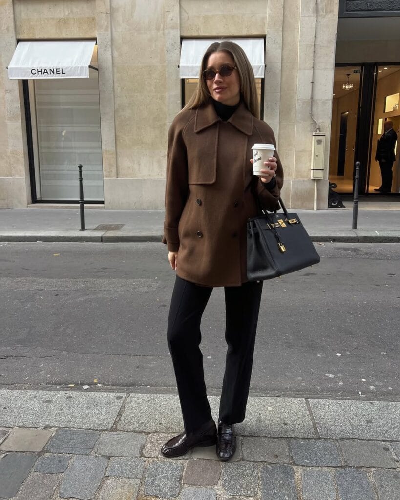 @ lovisabarkmanShe rocks a structured chocolate brown wool coat layered over a dark turtleneck with sleek black trousers. Classic loafers and a polished black handbag make this the perfect smart city ensemble.