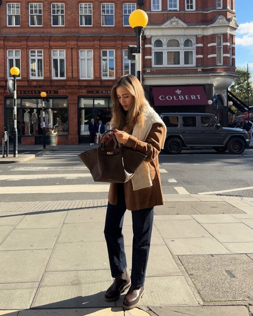 @ kateehutchinsA caramel suede jacket trimmed with cream shearling tops off a cozy neutral knit and straight dark jeans. Chunky brown Chelsea boots and an oversized tote bring a laid-back, off-duty edge.