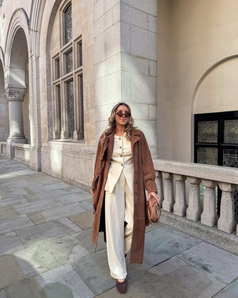 24. Cinnamon Suede Trench with Cream Tailored Set