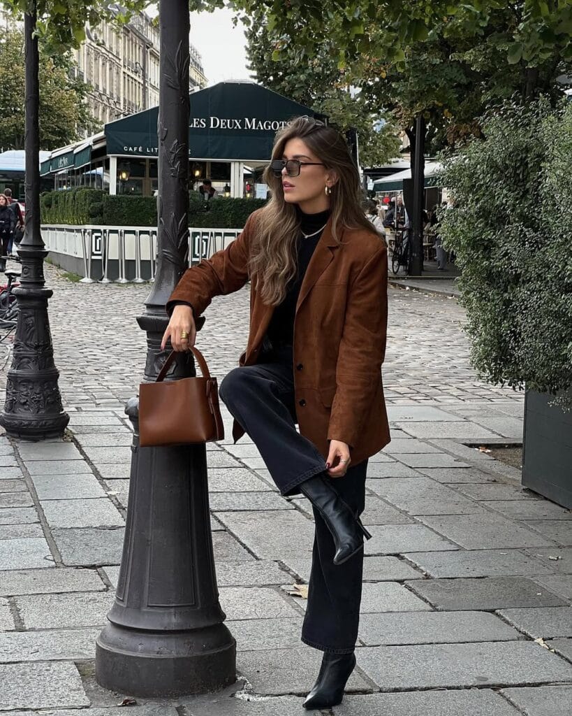 @ heloise.guilletA timeless brown suede blazer sits atop a sleek black turtleneck and high-waisted dark jeans. Pointed black boots and a structured brown handbag elevate this effortlessly stylish city outfit.