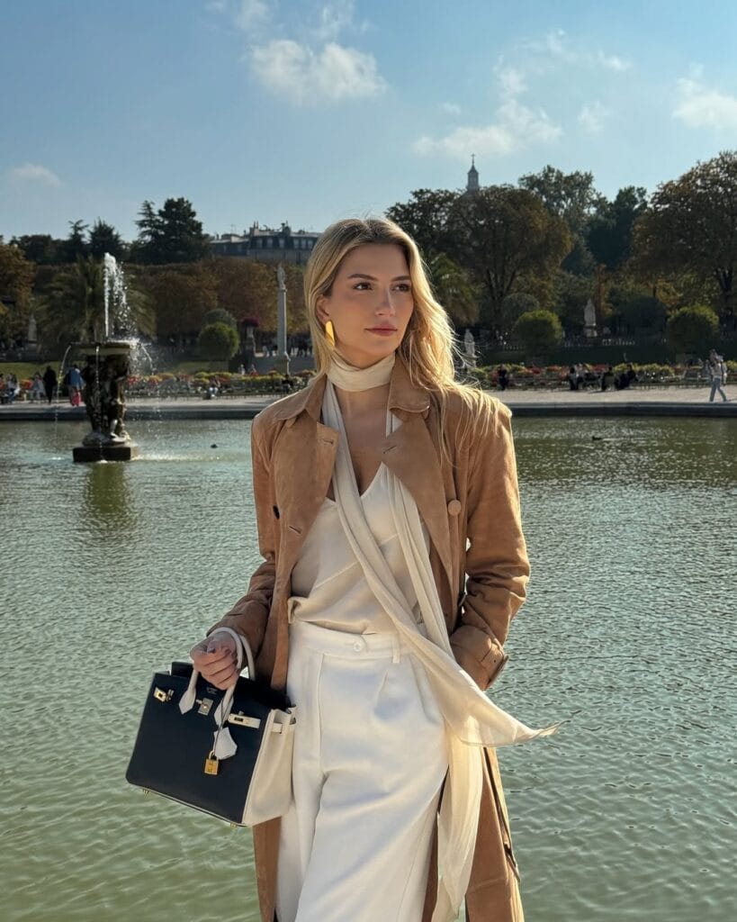 @ cassdimiccoA soft camel suede trench drapes elegantly over a breezy white blouse and crisp cream trousers, creating a sophisticated, layered look. This ensemble perfectly balances structured tailoring with relaxed textures, ideal for a stylish day out.