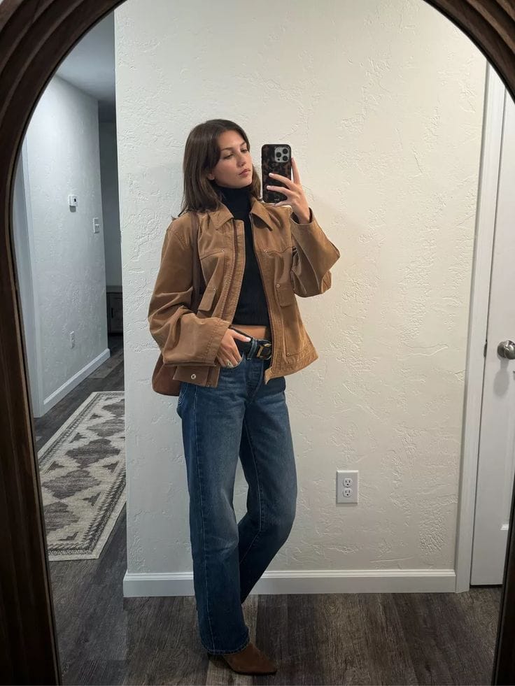 3. Tan Suede Jacket with Black Turtleneck and Jeans