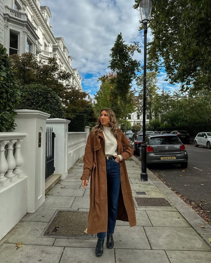 29. Caramel Suede Duster with Cream Sweater and Dark Jeans