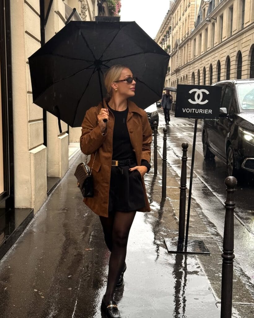@ allchloeroseShe wears a caramel suede jacket layered over a black mini dress and sheer tights for a sleek, Parisian-inspired outfit. Gold-accented loafers and an umbrella polish off this rainy-day urban look.