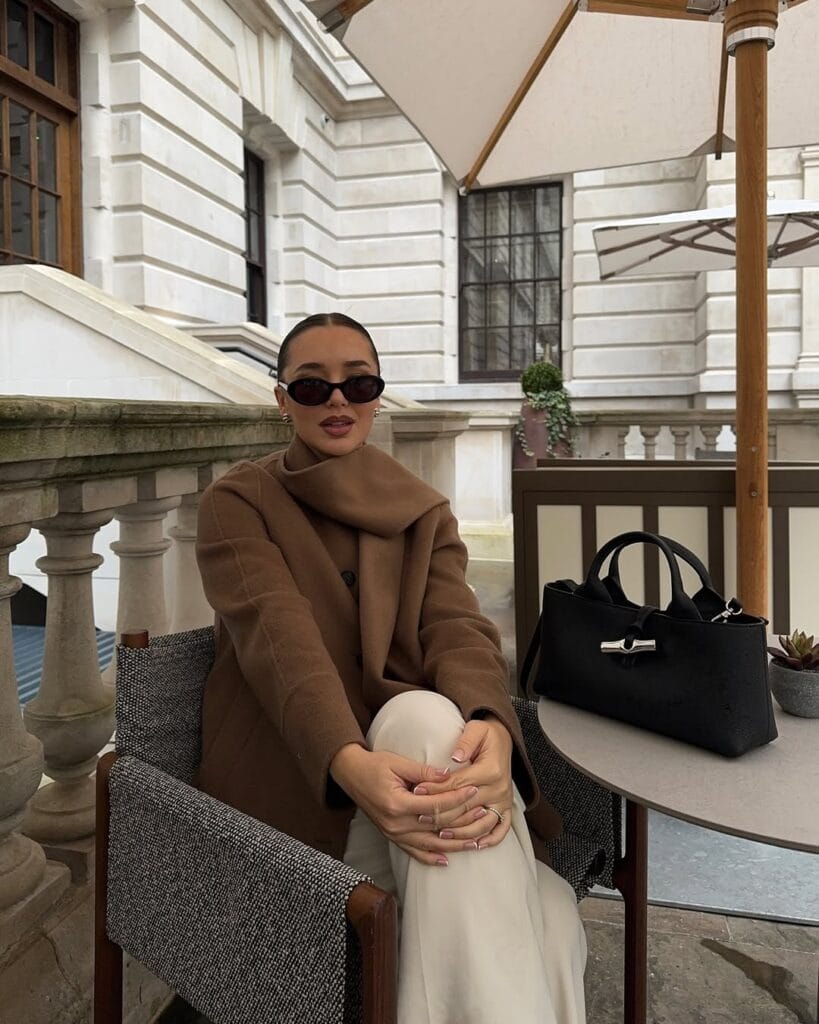 @ fleurraffanSheās bundled up in a chic mocha wool coat paired with elegant, wide-leg cream trousers for a refined, neutral look. Minimal jewelry and a classic black handbag add the perfect understated finish.