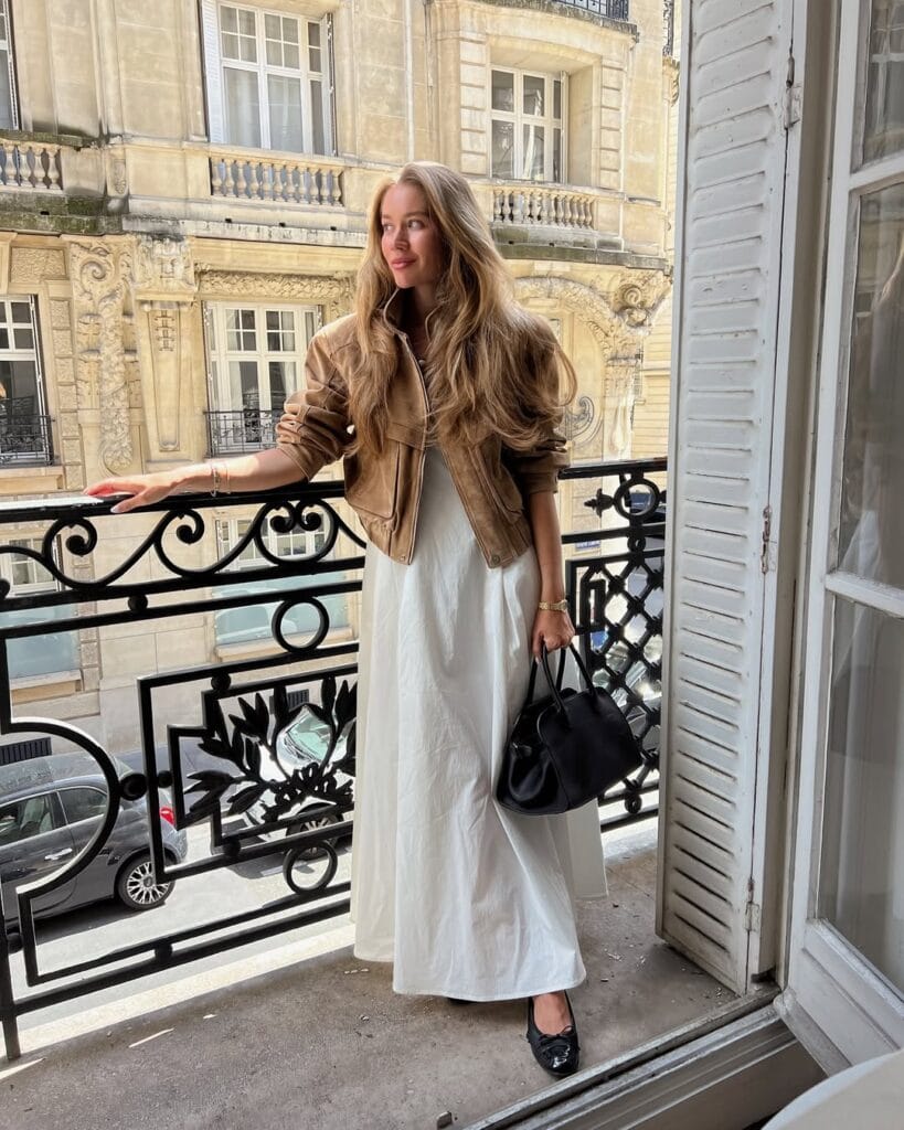 @ lovisabarkmanSheās styled a cropped caramel suede jacket over a sweeping white maxi dress, creating a dreamy, effortless silhouette. Simple black flats and a classic black handbag bring the look together for instant Parisian chic.