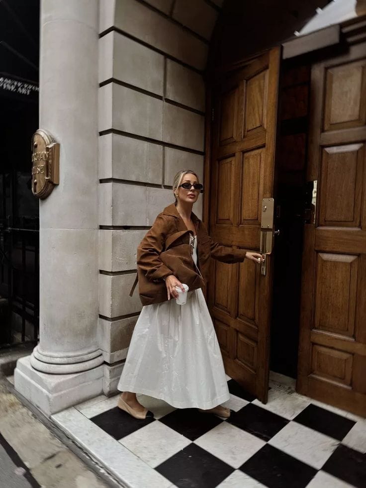 5. Oversized Brown Suede Jacket with White Maxi Skirt