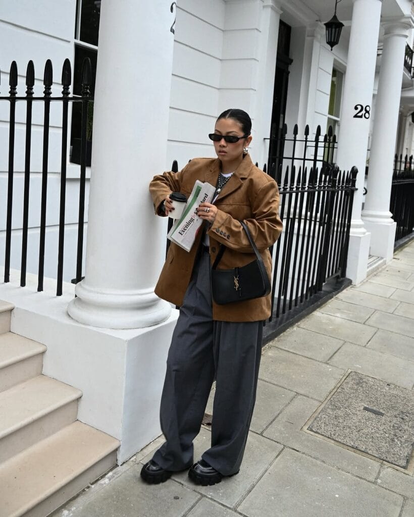@ sybil.tingcShe goes for a boxy tan suede jacket layered over a grey top and slouchy charcoal wide-leg trousers. Chunky black shoes and statement jewelry make this outfit polished and fashion-forward.