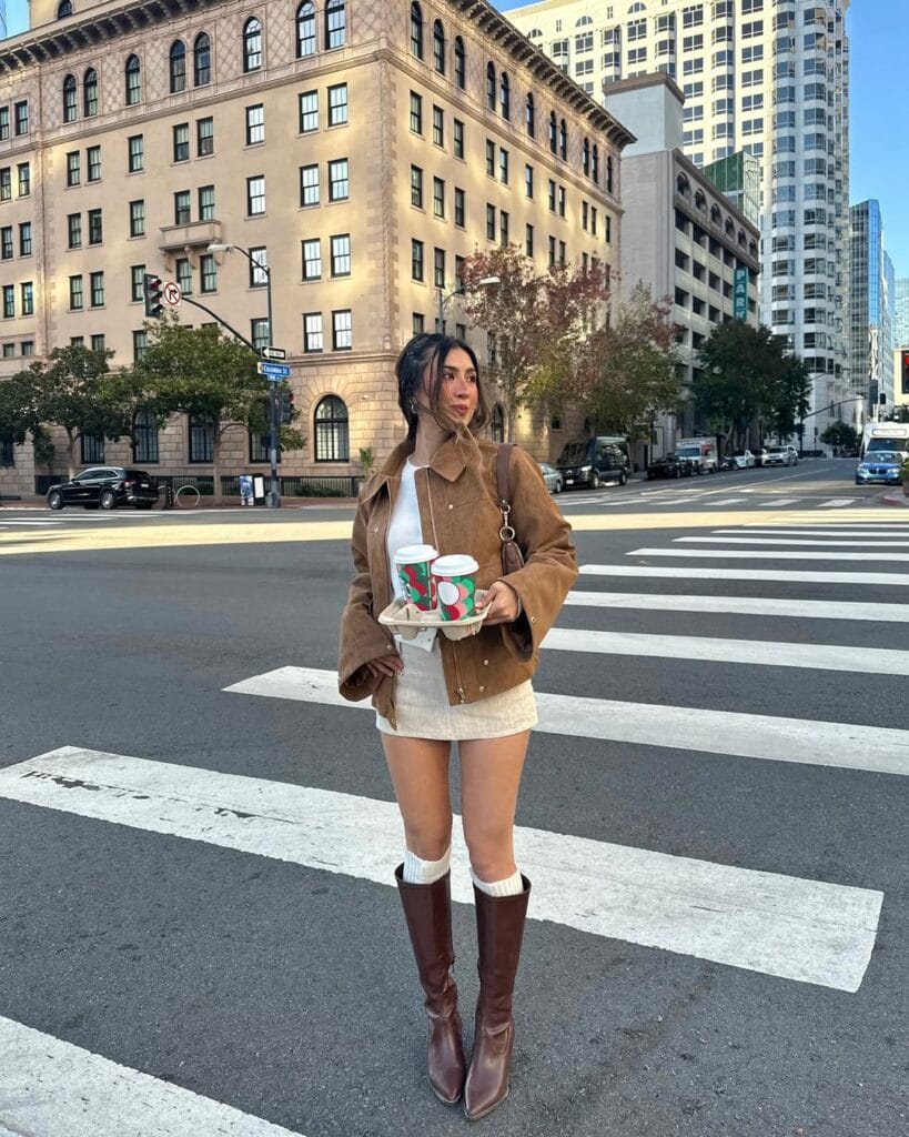 @ taniabydaySheās rocking a vintage-inspired tan suede jacket over a classic cream mini skirt and white top, cozying up the look with tall brown boots and slouchy socks. The outfit feels playful and chicāperfect for crisp city strolls and coffee runs!