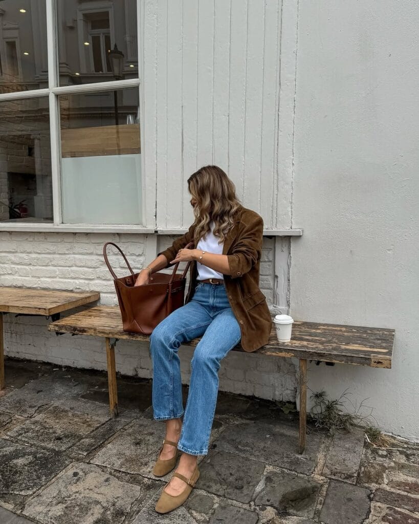 Sheās styled a relaxed tan suede jacket over a fitted black turtleneck, tucked into timeless blue straight-leg jeans with a sleek black belt. The ensemble feels laid-back yet put together, perfect for everything from coffee runs to casual Fridays!