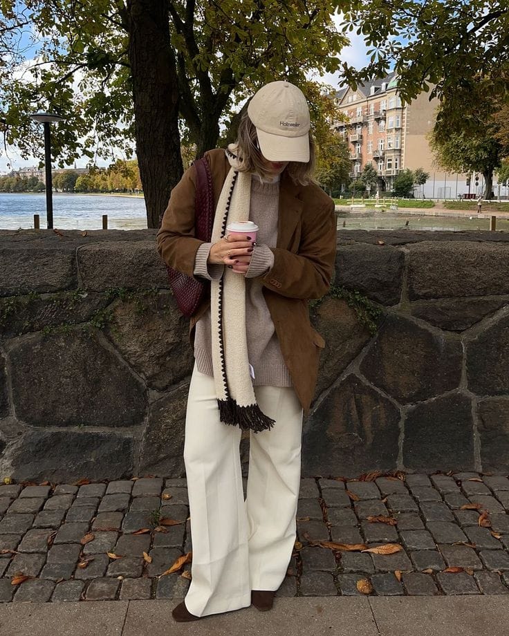 @ kristinervbSheās layering a decadent mocha suede blazer over an ivory knit and flowing wide-leg trousers. The creamy scarf and relaxed fit add an understated touch of elegance perfect for crisp autumn days.