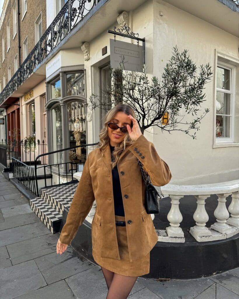 @ gemmatalbotShe rocks a tailored toffee suede blazer with a matching mini skirt and a classic black top. Itās a sharp, contemporary silhouette thatās perfect for strolling the city in style.