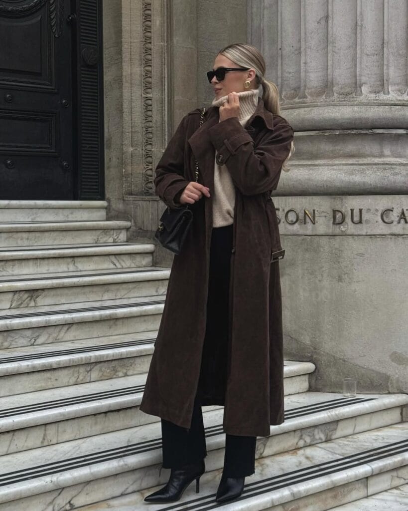 15. Opulent Chocolate Suede Coat with Cream Turtleneck & Black Trousers