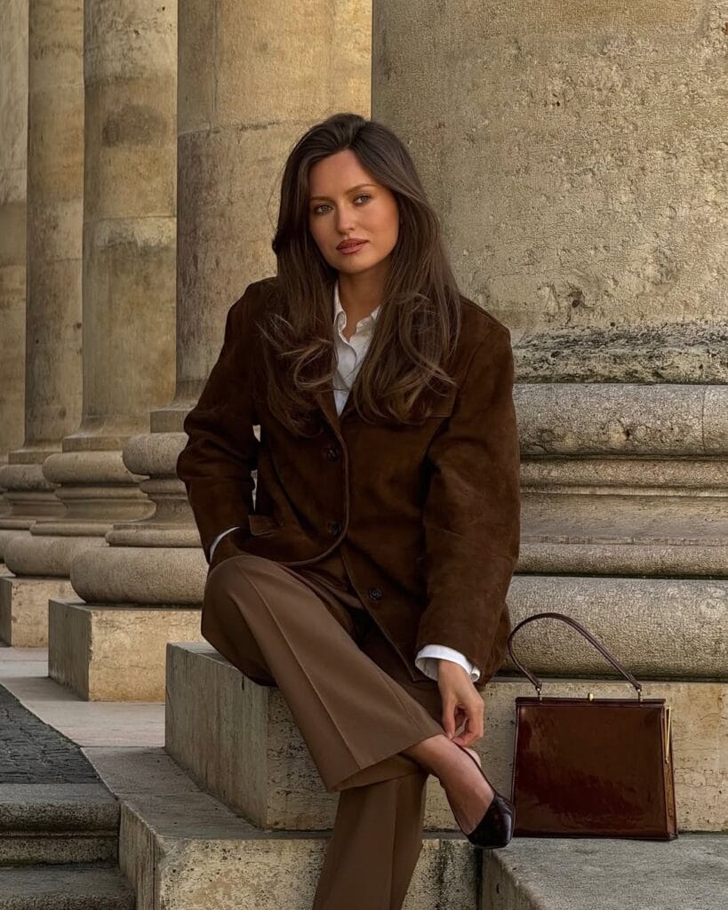 @ livia_auerSheās layered a rich chocolate suede blazer over a crisp white shirt and tailored taupe trousers. Sleek pointed flats and a glossy structured bag complete this refined, architectural look.