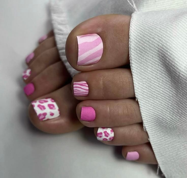 The big toe carries a soft pink matte base with lighter pink zebra stripe swirls across the full surface, while the smaller toes rotate between solid matte pink, a white base with pink leopard spots, and a pink base with deeper pink zebra lines.