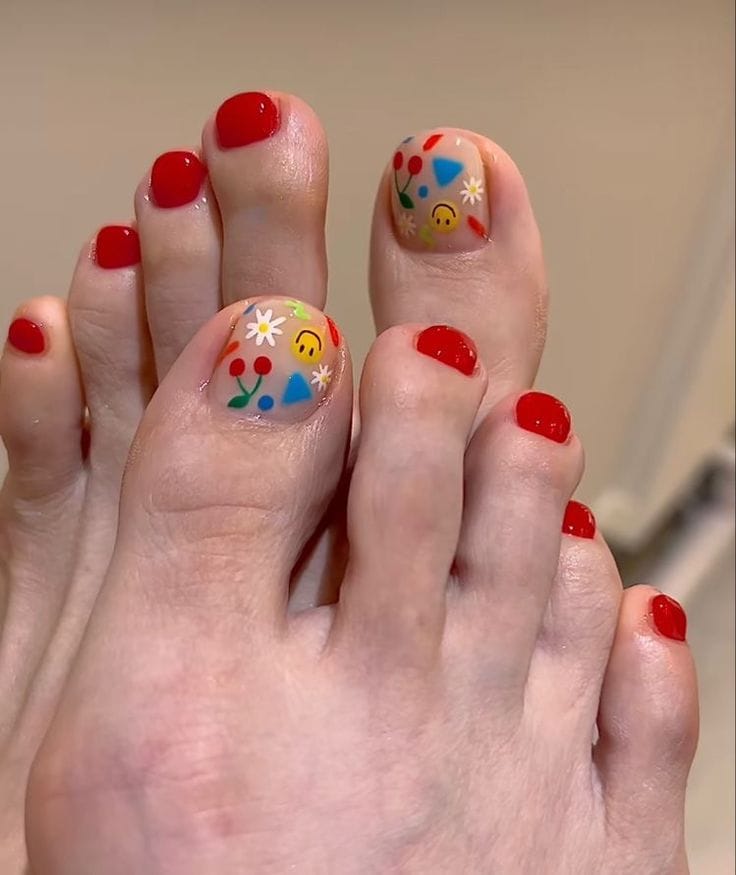 Glossy red fills all the smaller toes, while the big toenail carries a sheer nude base packed with a joyful mix of hand-painted white daisies, red cherries on green stems, a yellow smiley face, blue triangle shapes, and scattered multicolour dots.
