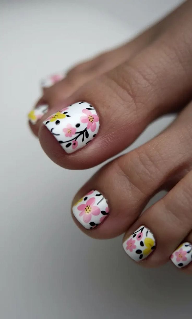 38. White Base with Pink and Yellow Botanical Toe Nails