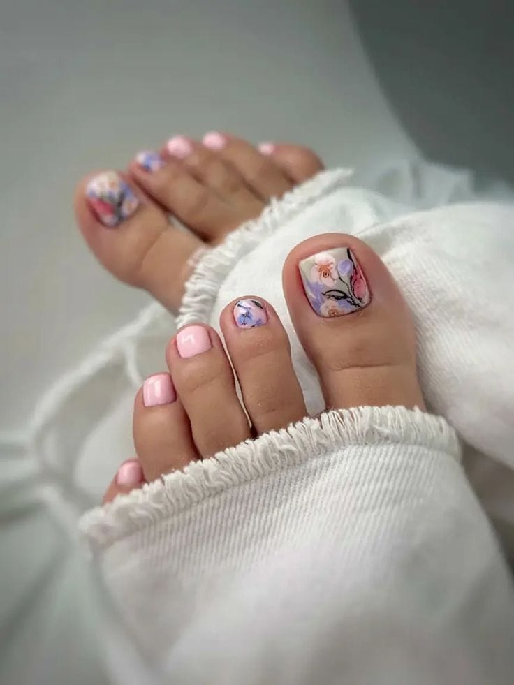 Soft glossy pink covers the smaller toes with a delicate single blue floral painted on the ring toe, while the big toenail features a painterly watercolour composition of peach, pink, and lavender flowers with dark stems on a soft white-lavender base.