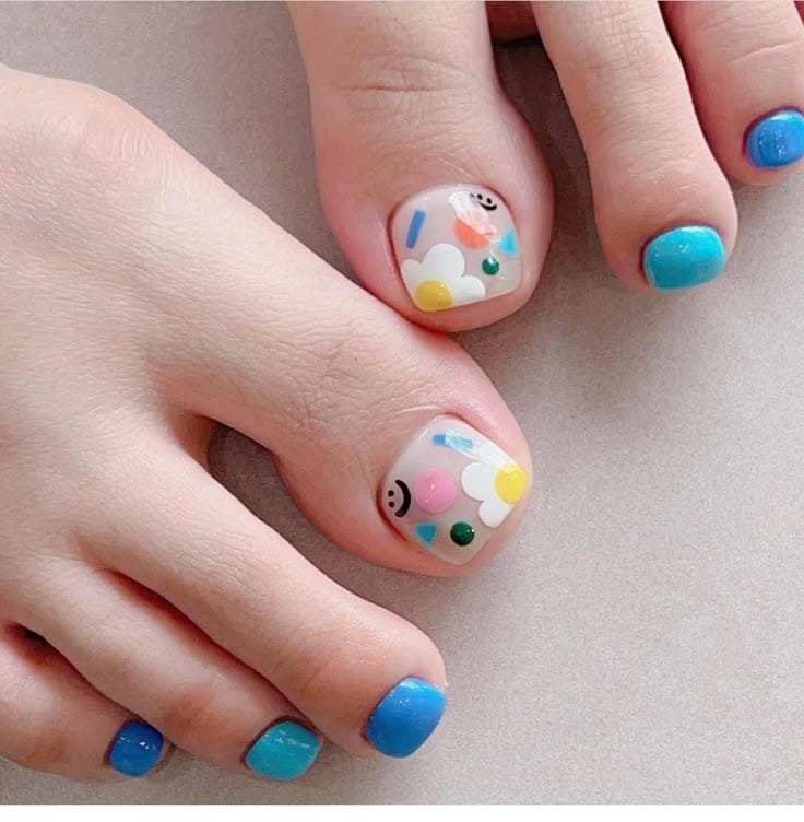 Solid cerulean blue covers the smaller toes on both feet, while the big toenails carry a sheer milky base layered with hand-painted kawaii sticker-style art ā white clouds with smiley faces, a yellow daisy, colourful geometric shapes, a pink circle, and green dots scattered across the surface.