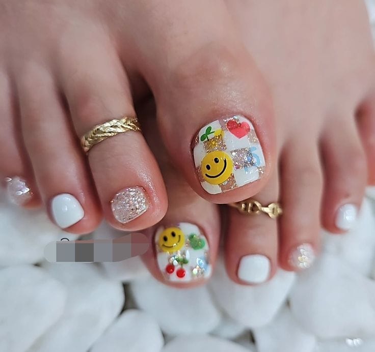 Clean opaque white covers most of the toes with one glitter accent nail, while the big toe features a detailed patchwork of gold-outlined colour blocks scattered with a bold yellow smiley face, a red heart, painted cherries, and dimensional charm embellishments.