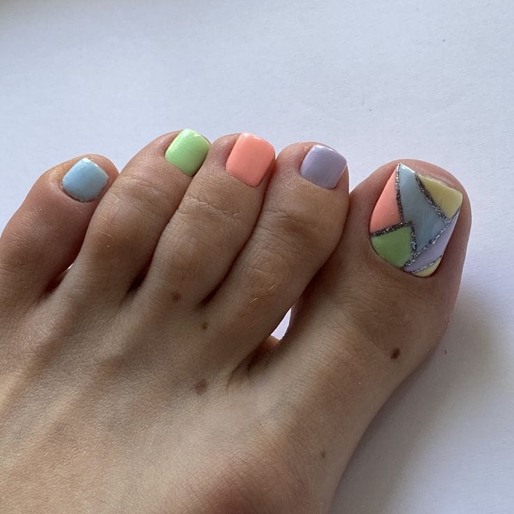 Each smaller toe carries its own individual pastel ā baby blue, mint green, coral peach, and soft lavender ā while the big toenail combines all four shades in a geometric mosaic design with silver chrome lines dividing each colour section.