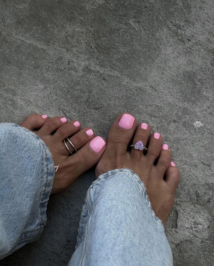 Every toe is painted in a single clean baby pink glossy finish, worn with a lavender crystal heart toe ring that picks up the softness of the polish colour.
