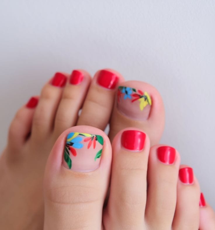 Glossy cherry red covers all the smaller toes, while the big toenail features a sheer bare base with bold hand-painted tropical flowers in red, cobalt blue, bright yellow, and deep green with black leaf detailing.