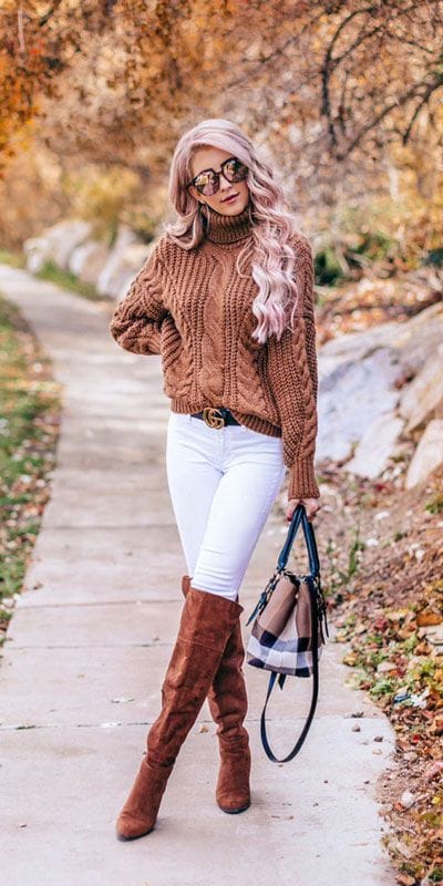 This warm and stylish combination of a chunky brown sweater and white skinny jeans screams fall and winter fashion. Brown suede knee-high boots and a plaid bag complete the look, perfect for a crisp afternoon walk.