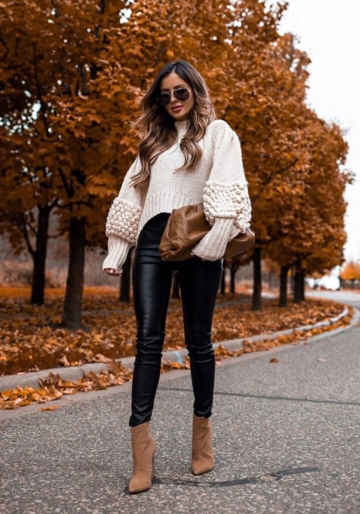 A textured cream sweater with balloon sleeves pairs beautifully with sleek black leather pants. Beige ankle boots and a brown clutch add warmth to this edgy yet cozy outfit, perfect for casual yet polished outings.
