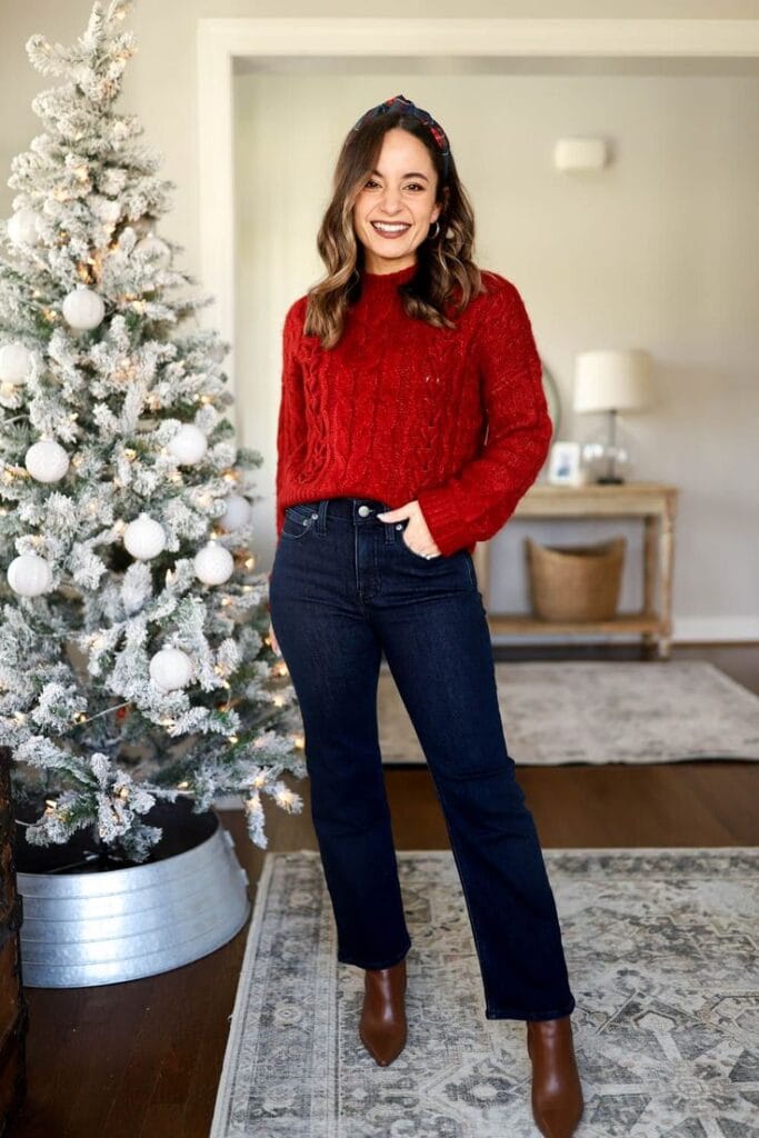 A vibrant red cable-knit sweater paired with dark denim jeans creates a cheerful holiday-inspired outfit. Brown leather ankle boots and minimal accessories make this look festive yet casual, ideal for a cozy day at home or holiday celebrations.