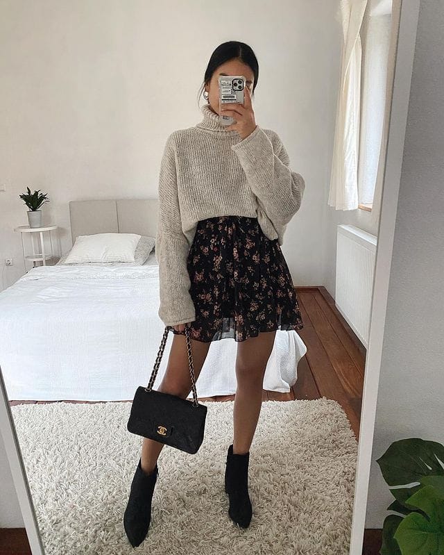 This outfit pairs a cozy gray turtleneck sweater with a chic floral mini skirt. Perfectly accessorized with ankle boots and a sleek handbag, this look is both feminine and versatile for casual outings or cozy indoor gatherings.