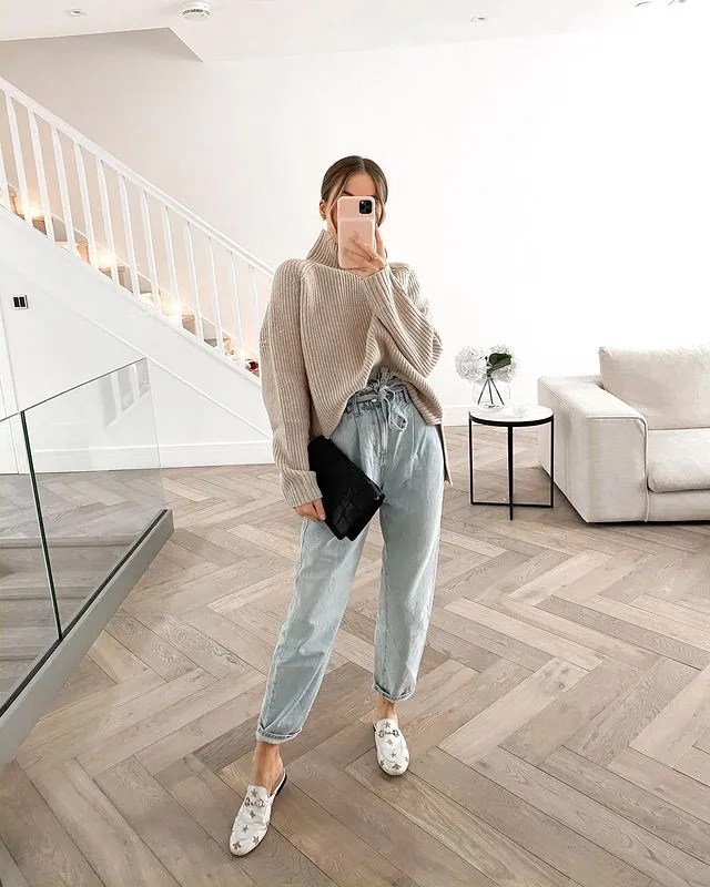 A neutral ribbed sweater paired with loose-fit denim and stylish loafers exudes casual elegance. Accessorized with a black clutch, this outfit is ideal for a relaxed yet trendy day out.