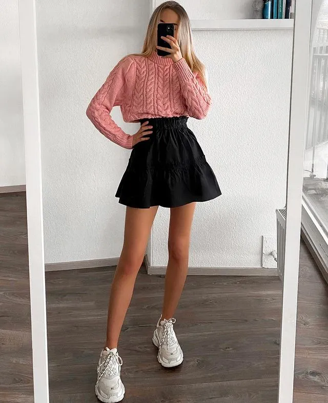 This playful outfit combines a vibrant pink cable knit sweater with a black high-waisted skirt. Paired with sneakers, itās a fun and youthful option for a casual outing.