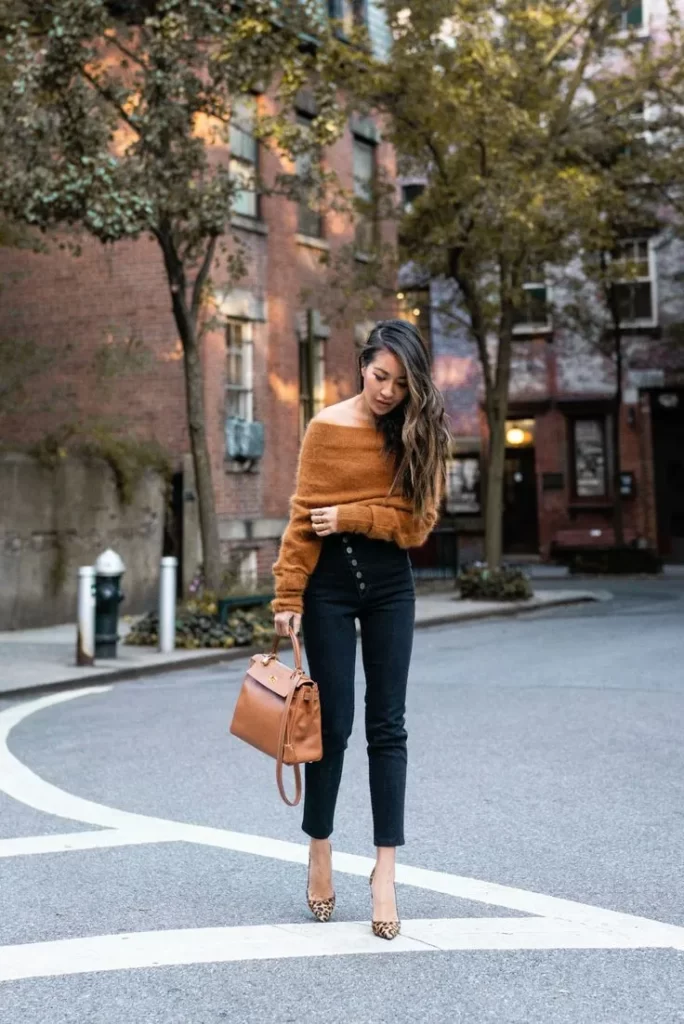 A caramel-toned off-shoulder sweater tucked into high-waisted black skinny jeans creates a flattering silhouette. The leopard print heels and structured tote bag elevate the look, making it great for a cozy dinner date or chic daytime outing.