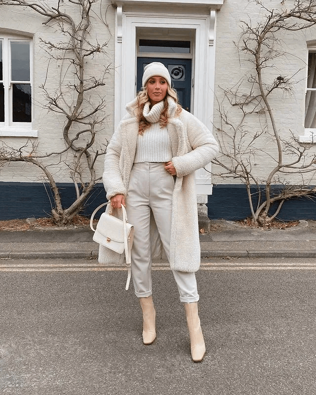 A stunning monochromatic winter outfit with a chunky knit sweater, tailored pants, and a cozy coat. The ivory tones create a clean, sophisticated vibe, while matching boots and a beanie keep it weather-appropriate and stylish for snowy days.