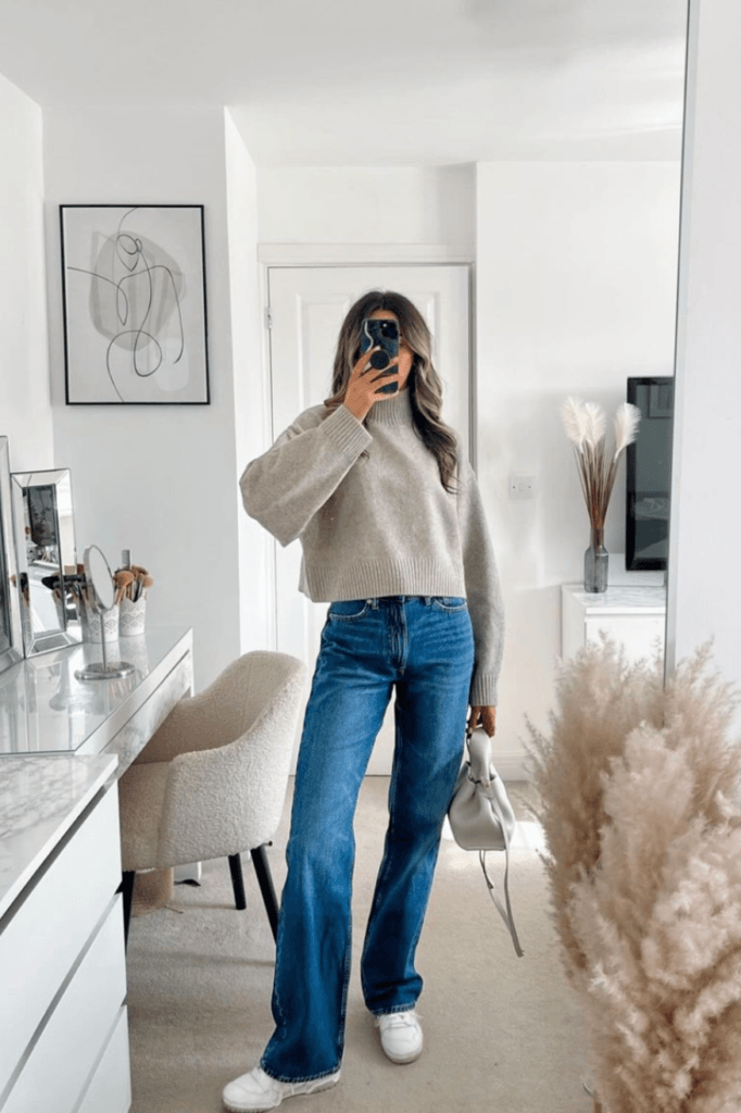 A cropped gray sweater styled with high-waisted wide-leg jeans offers a relaxed yet put-together vibe. White sneakers and a small handbag complete this casual yet stylish outfit.