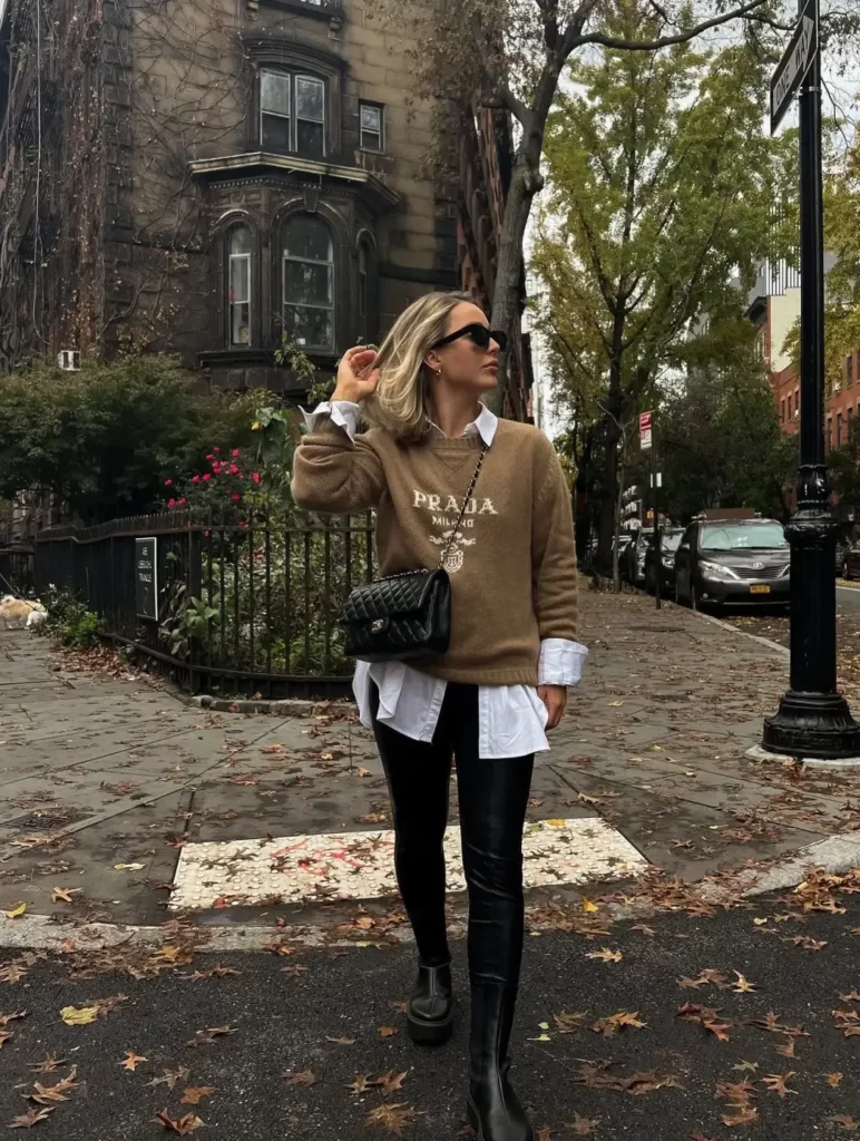 This preppy look combines a Prada sweater layered over a crisp white shirt with edgy leather pants. The structured bag and black boots add a polished touch, making this an ideal choice for urban adventures or casual business outings.