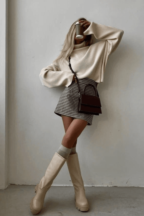 This outfit pairs a cream oversized sweater with a plaid mini skirt and tall beige boots. The addition of knee-high socks and a structured bag gives a playful, preppy vibe.