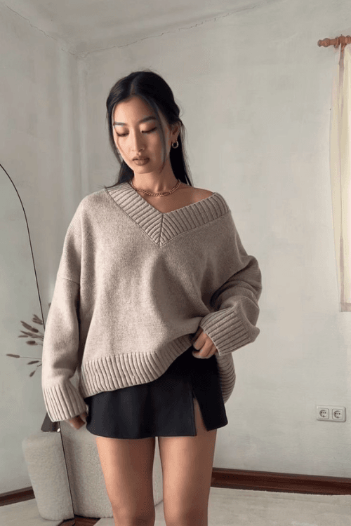 The oversized beige V-neck sweater with a black mini skirt creates a comfy and laid-back aesthetic. The monochrome palette keeps it chic and versatile for any casual outing.