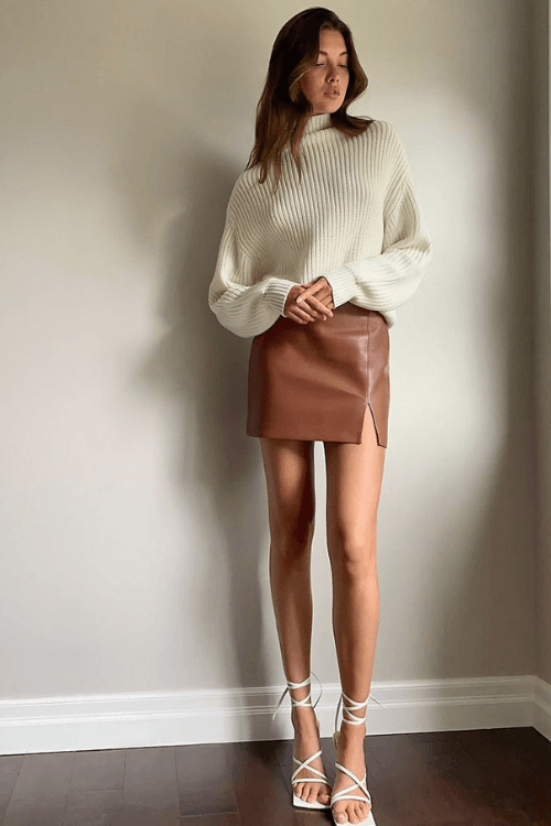 A white chunky sweater paired with a brown leather mini skirt offers a chic and modern look. Styled with strappy heels, this outfit is ideal for transitioning from day to night.
