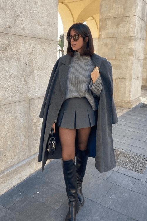 This look combines a grey pleated skirt, knee-high black boots, and a matching oversized sweater layered with a grey coat. It’s perfect for a winter day outing, balancing warmth and sophistication.