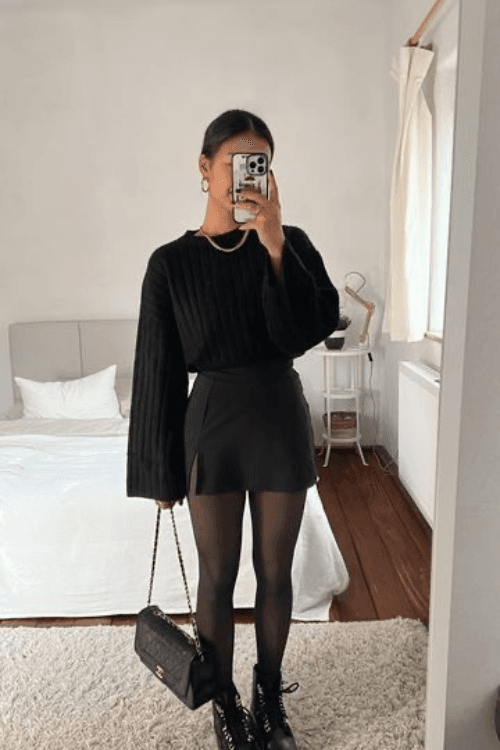 A sleek black sweater paired with a black mini skirt and tights creates a polished and cozy outfit. With combat boots and a Chanel bag, this look exudes modern simplicity and elegance.