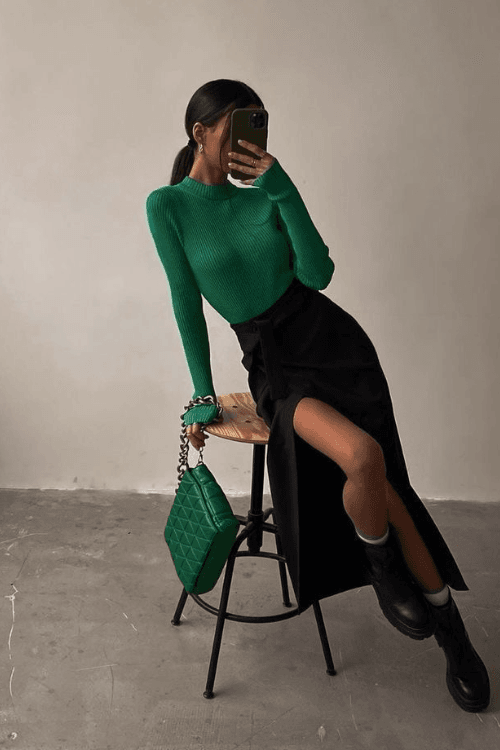 This vibrant green sweater with a black maxi skirt and boots creates a striking contrast. The slit in the skirt adds an edgy touch, while the matching green quilted bag completes the bold outfit.